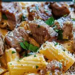 This Cajun steak tips in cheesy rigatoni Parmesan sauce is a creamy, bold, and satisfying pasta dish that combines seared Cajun-spiced steak tips with rich Parmesan cream sauce and hearty rigatoni pasta.
