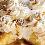 This easy cream puff dessert transforms classic choux pastry into a simple layered 13×9-inch treat. Featuring a light, airy crust topped with rich chocolate cream filling, fluffy whipped topping, and finished with chocolate, caramel, and almonds, it’s an impressive yet effortless crowd-pleaser.