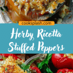 These herby ricotta stuffed peppers are a vibrant and delicious vegetarian dish. Bell peppers are roasted and filled with a creamy blend of ricotta, mozzarella, parmesan, fresh herbs, and spinach, then topped with crunchy breadcrumbs. Perfect as a side or light main course.