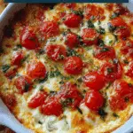 Once everything is well mixed, I spread the dip evenly into the prepared dish. I scatter the remaining tomato halves over the top and place it in the oven. I bake the dip for about 25 minutes, until it’s hot, bubbly, and lightly golden on top. After removing it from the oven, I let it cool for a few minutes before garnishing with fresh basil and serving.