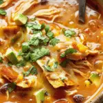 This creamy chicken enchilada soup combines shredded chicken, beans, corn, and spices in a rich, seasoned broth finished with melted cream cheese for a comforting, flavorful one-pot meal.