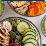 5. To assemble: layer noodles, lettuce, cabbage, carrots, cucumber, and edamame in each bowl. Slice cooked chicken and place on top.