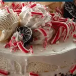 This Peppermint Ice Cream Cake is a no-bake holiday dessert featuring a chocolate cookie crust, layers of peppermint and vanilla ice cream, whipped topping, and festive peppermint garnish. It’s an easy, make-ahead treat perfect for entertaining.