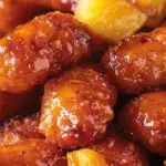 I sprinkle the brown sugar evenly over everything, making sure the sausages and pineapple are well coated. I bake the dish uncovered for 35 to 40 minutes, stirring once halfway through so the glaze coats everything evenly. I let it rest for a few minutes before serving to allow the sauce to thicken slightly.