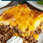 It’s a hearty, budget-friendly baked casserole made with pasta (like noodles or macaroni), seasoned ground beef, a creamy tomato-cheese sauce, and melted cheese on top. It’s similar in spirit to dishes like baked pasta casseroles, combining familiar pantry staples into a satisfying comfort meal.