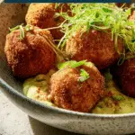 Baked salmon balls served with a smooth, creamy avocado sauce, combining fresh seafood flavor with light, wholesome ingredients for a healthy and satisfying dish.