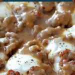 Meanwhile, prepare the gravy: combine the prepared country gravy mix with cooked sausage crumbles, stirring until smooth and heated through.