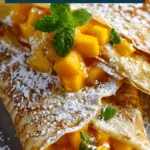 Delicate crêpes filled with creamy mango coconut filling, topped with fresh mango, shredded coconut, and powdered sugar for a tropical-inspired breakfast or dessert.