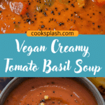 A rich, comforting vegan tomato basil soup made by roasting fresh tomatoes, onion, and garlic, blended until creamy with optional coconut milk and topped with crispy chickpeas for added texture and protein.